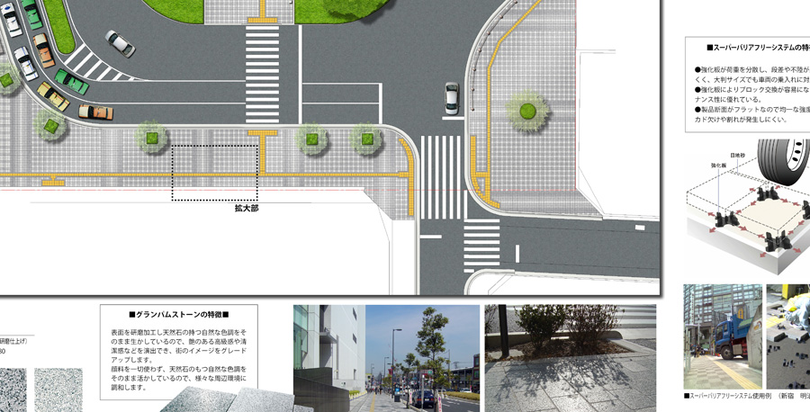 その街のイメージや特徴は、舗装のデザインと大きく関わっています。景観との統一感がない舗装、つぎはぎのような修繕が施されている路面では、街の印象が悪いものになってしまいます。そのようなことがないように、私たちは舗装材の色彩計画からコンセプト作成、完成予想図CG提案、技術資料・比較検討資料作成など、よりよい空間づくりに向けたサポートを行っています。